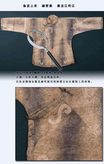 赫哲族的魚皮衣歷史久遠。我國古代文獻《山海經》第九卷《海外東經》中便有“玄股之國,在其(黑齒)北,其為人衣魚食鷗” 的記載?!耙卖~”西晉學者郭璞解釋為“以魚皮為衣也?!闭f明早在兩千多年前,赫哲族的先民就已使用魚皮做衣服了。另據密山新開流新石器時代遺址中出土的魚叉及骨針,證明赫哲族的先民捕魚和縫制魚皮衣有數千年歷史了。清代張晉彥的《寧古塔山水記》有:“魚皮部落,食魚為生,不種五谷,以魚皮為衣,暖如牛皮”的記載?!痘是迓氊晥D》記載:“赫哲衣服多用魚皮而緣以色布,邊綴銅鈴,亦與鎧甲相似?!绷硗?,地方志書對此也多有記載??梢?,赫哲族制作和穿著魚皮衣是真實而久遠的。