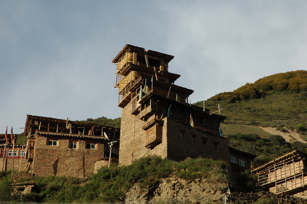 碉房是藏族很具代表性的民居之一,多為石木結(jié)構(gòu),外形端莊穩(wěn)固,風(fēng)格古樸粗獷。碉房一般有三到四層。底層養(yǎng)牲口和堆放飼料、雜物;二層布置臥室、廚房等;三層設(shè)有經(jīng)堂。由于藏族信仰藏傳佛教,誦經(jīng)拜佛的經(jīng)堂占有重要位置,神位上方不能住人或堆放雜物,所以都設(shè)在房屋的頂層。為了擴(kuò)大室內(nèi)空間,二層常挑出墻外,輕巧的挑樓與厚重的石砌墻體形成鮮明的對比,建筑外形因此富于變化。