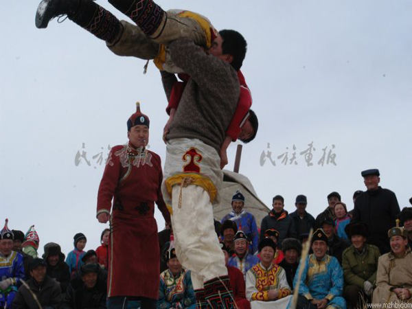 春節(jié),蒙古人稱為“白節(jié)”、“大年”,是蒙古人傳統(tǒng)節(jié)日,時間在農歷正月初一。居住在農村、城市、工礦區(qū)的蒙古族過春節(jié)的習俗同漢族差不多,但牧區(qū)有許多不同的特點。除夕之夜為“守歲”,合家老小席地坐在蒙古包中的矮桌周圍,桌上擺著一盤盤香噴噴的肉類、奶食品,以及糖果、香煙、美酒等物,有的還要在矮桌上供一張大紙,紙上寫著祖先的名字。午夜,開始飲酒吃年飯,或吃除夕餃子。按規(guī)矩團圓之宴要多吃多喝酒、肉,食器要擺滿滿一席。如吃不完也要剩得越多越好,象征新的一年里吃喝不盡、年年有余。家里的年輕人,要向長者敬“辭歲酒”。特別有意思的是全家共吃一塊由酥油、糖、白面烙成的大圓餅,這叫吃新年餅,每人只吃一口,意思是全家永不分離,永久團圓,永遠過甜甜蜜蜜的日子。除夕之夜要?!案吕尽保ㄍ嫜蚬穷^)、說書、唱歌、跳舞,通宵達旦,熱鬧一宿。過大年,按習慣還要拜年,大年三十晚上為辭舊歲禮, 初一早上為迎新年,晚輩給父母和老人叩頭、敬酒、獻哈達,祝老人們身體健康,晚年幸福!老人擁抱孩子們,并斟上一碗鮮奶,祝愿子女們幸福,像牛奶一樣純潔。大年初一早餐后,男女盛裝,三五成群來到浩特(村鎮(zhèn)),挨家串戶給親友拜年。客人進屋首先向長輩叩頭拜年,祝愿老人身體健康,年豐人壽。按習慣由主人家的女婿向客人逐個敬酒,每敬必喝,或邊喝邊唱,邊唱邊舞。