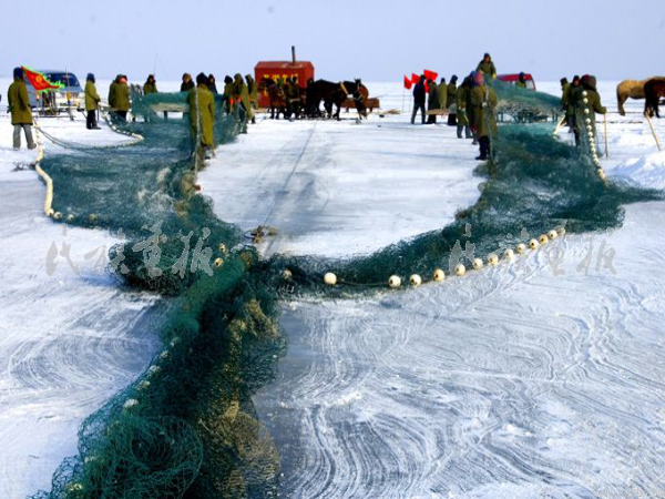 進(jìn)入冬季,當(dāng)氣溫降到攝氏零下30多度的時(shí)候,煙波浩淼的查干湖被凝固成偌大的冰湖。湖面的冰層最厚能達(dá)1米多,而查干湖平均深度只有2.5米。上面的冰層正好把魚群壓到下面1.5米的湖底,這就比較容易用大網(wǎng)把魚兜上來。從這一點(diǎn)講,寒 冷的氣候特點(diǎn)、適宜的水深和平坦的湖底為查干湖漁獵提供了有利的捕魚條件。
