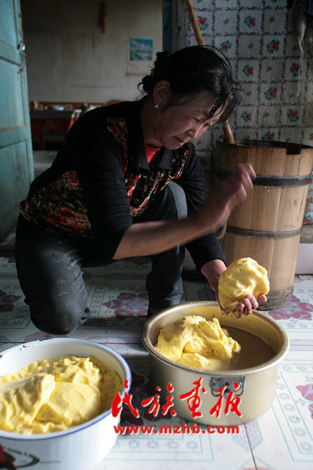 經(jīng)過反復搗動、分離而制成酥油,并將其保存在牦牛胃制成的口袋里