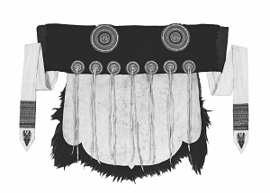 剪裁時(shí),將羊皮修剪成U型,上部橫鑲一段黑氆氌(毛織品)或黑呢子,內(nèi)襯天藍(lán)色棉布。其下用七對(duì)白色鹿皮條穗縫綴并列的七個(gè)小圓形彩線繡花布盤,肩部縫綴兩個(gè)大圓形彩線繡花布盤。羊皮上端縫釘兩條繡花白布長(zhǎng)帶,帶端還繡有花鳥、魚蟲、動(dòng)物、植物、幾何等圖案,據(jù)說是象征納西族人民如蜂似蝶地奔忙,以辛勤勞動(dòng)換取甜蜜生活。