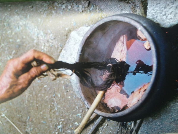 “織”是指使用踞腰織機,采用通經斷緯的紡織方法織出各種花紋圖案,在織布時,先手工掛經,綁住藤或樹皮布腰帶,用腳踩織機的經線木棍,席地而坐織布??椈ㄊ怯煤谏蛩{黑色做底線(經線),根據圖案需要,將各種染色的線搭配,拉經線、投緯線(彩色線),用木刀打緊緯線,織出各種花紋圖案。