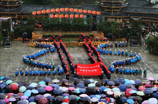 圖為(雷山達地水族鄉(xiāng))雨中表演水書 (原載中國網(wǎng)·中國民族) 引自民族畫報