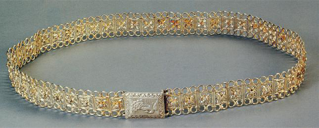 傣族銀腰帶傣族婦女喜歡帶手鐲、戒指、耳墜、項鏈等,這些物飾金質(zhì)、銀質(zhì)、玉石均可,仿制品也行。女嬰生下來幾天,就由家長用消過毒的針為娃娃扎耳,為帶耳環(huán)作準備。對女性而言,銀腰帶更是不可缺少之物,腰帶上飾以孔雀、蓮花等各種花型。女人們認為銀腰帶越寬就越美(圖為傣族銀腰帶,以上圖片為中央民族大學博物館館藏)。