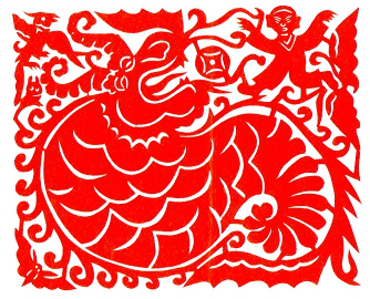 苗族民間剪紙的獨(dú)特之處還表現(xiàn)在構(gòu)思的新穎奇妙上。如《姜央兄妹合磨成親》圖,藝人為了擴(kuò)大意境,打破了時(shí)間與空間的限制,把發(fā)生在不同時(shí)間與空間的事物描繪在一幅畫面上。作者大膽而巧妙地把畫面分成天空、山頂和山腳三部分,來(lái)表現(xiàn)三個(gè)不同的情節(jié)。天上飛的是蝴蝶和山雞,山頂上站著拍手叫好的姜央,山腳下站著姜央的妹妹以及已合上了的石磨,還有被從山頂上滾下來(lái)的石磨嚇驚了的野兔。這幅畫面生動(dòng)形象地描繪了洪水泛濫后,地上的人都被淹死了,姜央和妹妹藏在葫蘆中幸免于難,為了繁衍人類,兄妹只好成親等情節(jié),非常巧妙地使這一遠(yuǎn)古傳說(shuō)得到精致的再現(xiàn)。又如三接式袖花剪紙圖案,畫面中間是雙象斗獸,上方是人馴蠶身龍,下面是龍象相爭(zhēng),其余空處是魚鳥蟲蝶。這種奇特的構(gòu)思,把原始社會(huì)人與自然的關(guān)系表現(xiàn)得淋漓盡致。