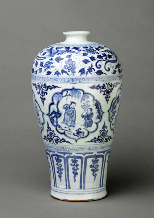 裝飾繁密是典型元青花的重要特點,它們由細巧的文化組成若干條帶環(huán)繞器身,裝飾帶數(shù)量通常很多,但惟獨沒有7層的,因為這個數(shù)字和蒙古族的喪葬與元代的刑罰有關(guān)。相反,9層裝飾帶的元青花卻為數(shù)不少,而這與蒙古族重九顯然有著直接的聯(lián)系【圖為元代后期青花四愛圖梅瓶。湖北省博物館藏】。