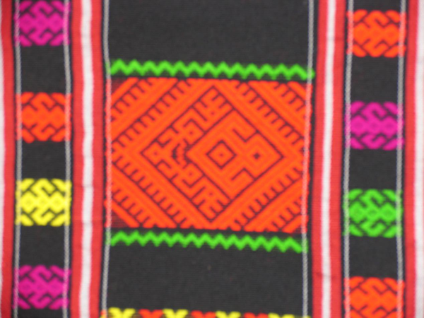 黎錦花紋圖案豐富多彩,多達百余種。較有代表性的圖案有人物類圖案、動物類圖案、植物類圖案、天體類圖案、器物類圖案、文字類圖案。其中,“人物類圖案”是黎錦的基本核心、中心圖案,它在各種織錦中永遠居于中心位置,形成中心紋飾,其他圖案可根據(jù)需要,或放在它的周邊,或放在它的第三、第四等位上。人物類圖案有單個的,也有多個組合的,有全身的,也有半身和頭像的;同時也有復(fù)合圖的。復(fù)合圖像上,有三重人物圖像嵌套,大套中,中套小,形成復(fù)合效果,構(gòu)圖復(fù)雜,工藝精湛。人物類圖案即祖先紋或鬼紋,黎族民間管這類紋樣叫做“剖”、“登”,即“祖先”或“鬼”的意思。黎錦中的人物紋樣的定位,反映了黎族人的濃厚的祖先崇拜意識。