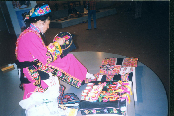 羌族傳統(tǒng)的民間工藝美術(shù)以挑花、刺繡最為出色。羌族姑娘從小就學(xué)習(xí)針線活,成年后都是女紅好手。刺繡時,無需草圖或畫線,心靈手巧的羌族婦女信手能刺繡成絢麗多彩的成品。挑繡時,以布的橫豎方格線為基準,采用挑、纖、扎、繡、勾、納、提、拼、扣等技法,單用或幾種并用,挑繡出來的幾乎都是栩栩如生的植物花卉、波浪等圖案。挑繡常用了頭帕、衣、褲、腰帶、鞋等易磨損處,既美觀又實用。一般煙荷包會繡兩種圖案,鴛鴦戲水和比翼雙飛,意在祈求男女雙方恩愛和諧。