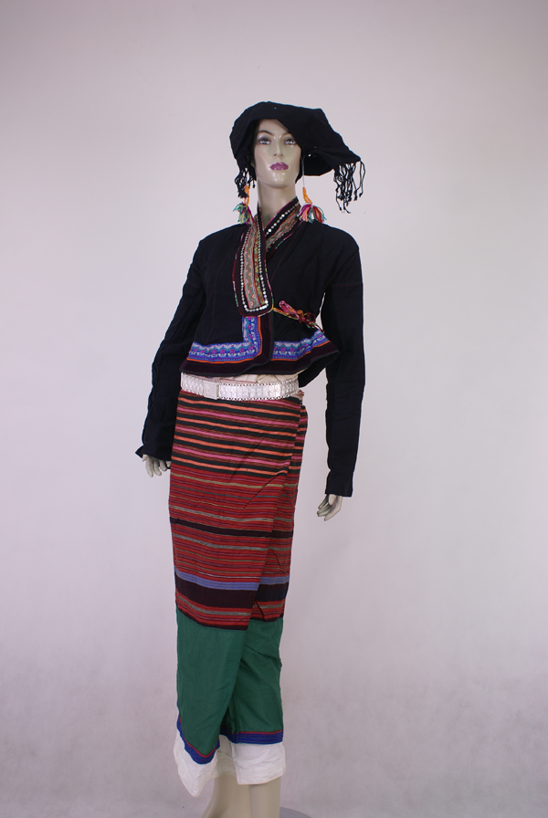 婦女的衣裙與傣族相似,上穿緊身短衣,頭頂挽髻,用頭巾纏頭,喜歡戴大耳環(huán)、銀手鐲等裝飾。姑娘愛戴野花或自編的彩花,將雙頰染紅。一般,女子上著左右兩祚斜襟窄袖黑色小褂,小褂為圓領(lǐng)、緊腰、寬擺,短及臀部,在左肋下拴線打結(jié),已婚婦女用黑色布料,未婚姑娘喜淺藍(lán)色或白色。里衫為無袖貼身夾衫,下穿兩條筒裙,內(nèi)裙為白色,外裙有兩色,臀部以上為紅色橫條,腿下為綠色或黑色,用布條或花邊鑲飾。未婚婦女用黑或藍(lán)布包頭;已婚婦女梳發(fā)髻,插銀簪,頂端鑲3顆棱形玻璃珠,下系銀鏈,纏包頭。婦女戴銀耳環(huán)、項(xiàng)圈、手鐲等飾品。