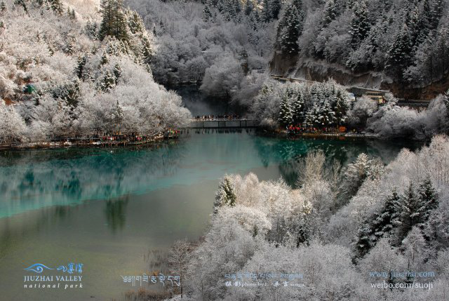 九寨溝四周群山聳峙,有雪峰數(shù)十座,高插云霄,終年白雪皚皚。河谷地帶奇水薈萃,其間有成梯形分布的大小湖泊114個,瀑布群17個,鈣華灘流5處,泉水47眼,湍流11段,以1870米的海撥高差,在12 座雪峰之間穿林跨谷,珠連玉接,呈Y字型串珠,逶迤近60公里,形成了中國唯一、世界罕見的以高山湖泊群和瀑布群以及鈣華灘流為主體的風景名勝區(qū)。湖泊小者數(shù)平方米,最大的長海長達7公里。湖水終年碧藍澄澈,色彩斑讕,在陽光照射下,呈現(xiàn)出藍、黃、橙、綠等多種色彩,絢麗奪目。天氣晴朗時,藍天、白云、雪山、森林倒映湖中,水光浮翠,美麗如畫,并隨季節(jié)推移呈現(xiàn)出不同的色彩和風韻,有“九寨歸來不看水”之說。