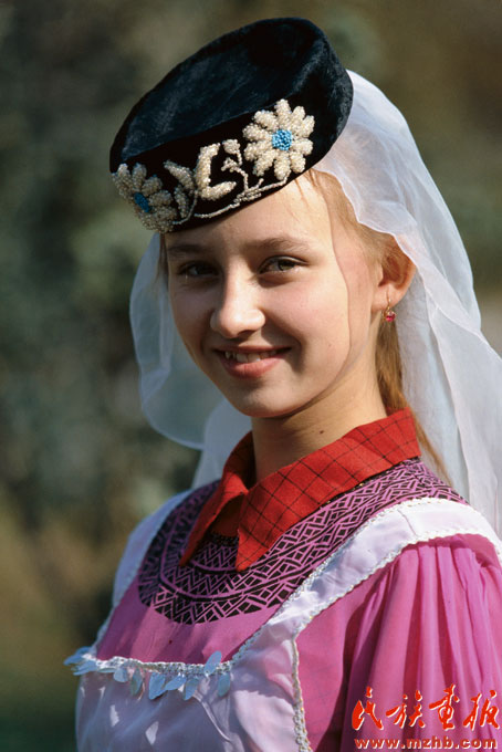 塔塔爾族的婚俗別具一格。按塔塔爾人的傳統(tǒng)習(xí)慣,婚禮在新娘家舉行,即先把新郎“嫁”出去,然后再“娶”回來?;橐鲞^程主要經(jīng)歷提親、相親、訂婚、納聘、嫁新郎、娶新娘六個(gè)過程(塔塔爾族少女。引自民族畫報(bào))。