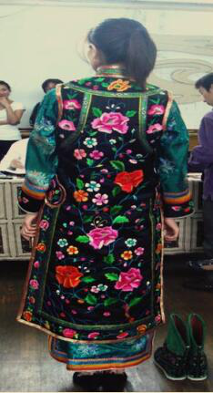 蒙古族科爾沁部的服飾,是內(nèi)蒙古自治區(qū)東部地區(qū)比較有代表性的蒙古族服飾,以用料講究、款式多變,色彩和諧,工藝復雜見長??茽柷卟菰系拇汤C,早年的時候,是比較簡單的,后來工藝流程才變得復雜起來,包括設計繡稿、勾稿、染線,上棚,配線,刺繡,下棚等若干步驟,其做工細膩,講究針法和紋路,每一件繡品都精益求精,一絲不茍,出來的繡品堪稱精品佳作。蒙古族刺繡的針法包括9大類40多種,有齊針、散針、稀針、接針、打籽、退暈等刺繡針法。