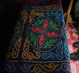 北方少數(shù)民族地區(qū)都沒有養(yǎng)蠶的條件,所以用于刺繡的絲線都需要與中原的物品交流當中索取,這也是在蒙藏地區(qū)有用各色的布出現(xiàn)貼花的原因??茽柷哔N花就是把各式各樣布料剪成紋樣貼在布底上再經(jīng)過縫邊,鎖邊而成的一種刺繡種類。這種貼繡在科爾沁蒙古族中是很普及的一種形式。這種貼繡能較好地運用大塊面的色彩,用料簡單,是刺繡中常用的一種方法。科爾沁刺繡在面料上刺繡圖案時用三種方法,第一種是把刺繡的圖案畫在紙上在把紙樣按照輪廓剪下來,然后放在要繡的底樣上,按照紙樣的輪廓進行刺繡。第二種方法是把圖案如實地在錦緞上描下來進行刺繡。第三種是直接在錦緞上自由發(fā)揮,繡出各種圖案。