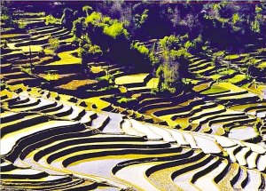 “萬(wàn)丈梯田,直撲云天,仿佛一道道天梯……”這些經(jīng)典詞匯,一但當(dāng)人們贊美梯田時(shí),就會(huì)不厭其煩地用上它們:“細(xì)碎精巧的漣漪……精凈如鱗的波紋……金色的碎片綴滿(mǎn)山體……滿(mǎn)山流光溢彩……”但是,梯田的寧謐、靜美,是屬于前現(xiàn)代性的,當(dāng)現(xiàn)代性在山腳窺伺并最終漫上梯田社會(huì),一切都將發(fā)生改變。