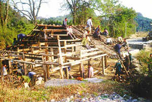 筆者看到的干欄式木樓和吊腳樓在使用的功能上相差無幾,上層住人待客,樓下四壁用木板圍擋,圈養(yǎng)畜禽,存放燒柴、農(nóng)具和秋收臨時堆放的糧食。豬圈靠里側(cè)依柱圍欄,其它空閑的地方打掃得干干凈凈,有的將織布機放在樓下明亮的地方。住房一般5間,兩頭兩間是偏廈,中間3間是寬敞的堂屋,一頭設火塘、土灶,為烤火、煮飯之處;另一頭的中柱供臨時設席敬神之用,也有的在板墻上設佛龕神位,供奉祖先;臥室依房柱用木板靈活隔間。大門有的開在房山墻一側(cè),也有開在中間的,皆登石階、板梯而上。吊腳樓一棟挨著一棟,小巷道曲折狹窄,只容牽牛和順向挑擔通過。