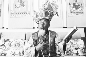 “東巴,在納西語里意為活佛或智者?!痹谟颀埣{西族自治縣圖書館,李瑞山一邊講解,一邊向筆者展示館藏文物,這其中包括占卜紙牌畫、祭祀法杖和東巴經(jīng)等。引起筆者注意的是一幅形似唐卡的卷軸畫,畫中的主人公竟是藏族詩人倉央嘉措?!坝脰|巴文所寫的《卓伯所》一書里,記載了納西族與藏族、白族先民之間同宗共祖的兄弟關(guān)系,這點與木氏宗譜碑上所刻是一致的。所以,我們有關(guān)于藏族的記載并不奇怪,民族交融自古就有。”