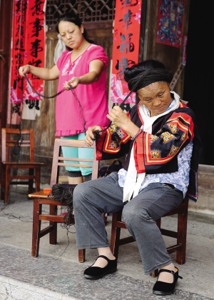 梳盛裝發(fā)型時,需要用到假發(fā)、毛線等輔助工具來補充發(fā)量,才能令整個發(fā)型豐滿有型。雖說是假發(fā),也是用收集來的真發(fā)編制而成的。盤發(fā)過程中女兒王萬就在一旁協(xié)助母親。其實王萬這一輩人,已經(jīng)不會梳這種傳統(tǒng)的發(fā)型了。