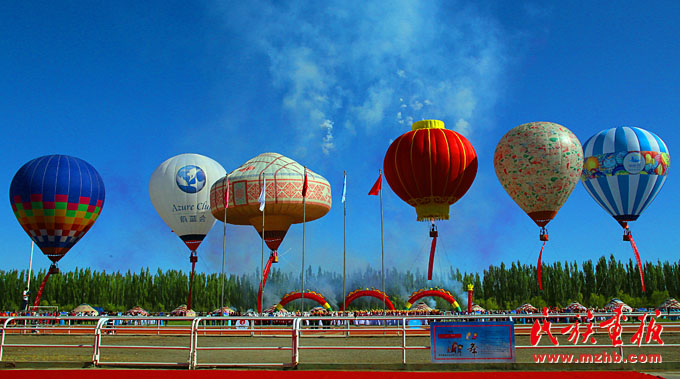 這6只熱氣球是甘肅省阿克塞哈薩克族自治縣的旅游風(fēng)景之一,其中氈房式(左三)熱氣球是阿克塞縣的旅游空中形象大使
