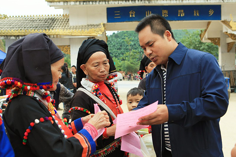 三臺(tái)山徳昂族鄉(xiāng)鄉(xiāng)長(zhǎng)楊?lèi)?ài)明和德昂族群眾參加農(nóng)業(yè)科技推廣活動(dòng)