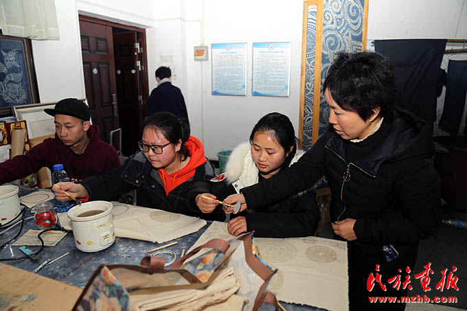 吳安麗老師在凱里學(xué)院藝術(shù)學(xué)院蠟染實訓(xùn)室指導(dǎo)學(xué)生