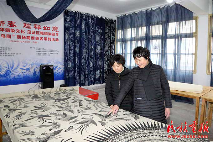 寧曼麗(右)和吳安麗在討論長 10 米、寬 1.6 米的蠟畫《百鳥圖》