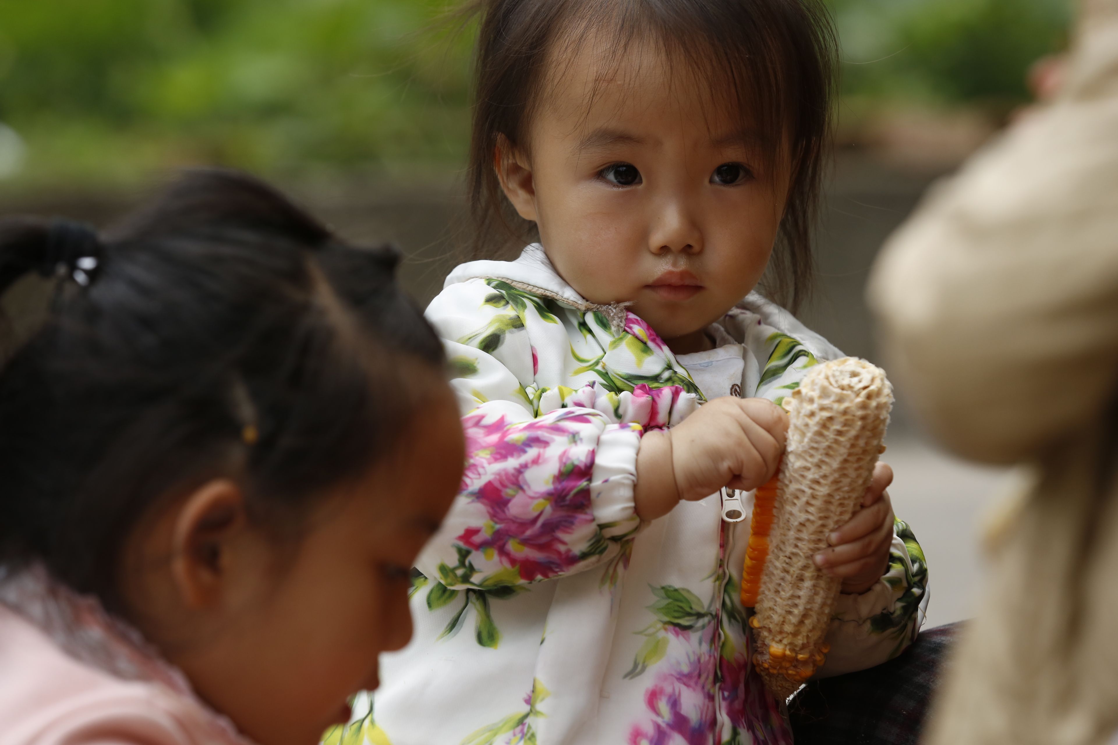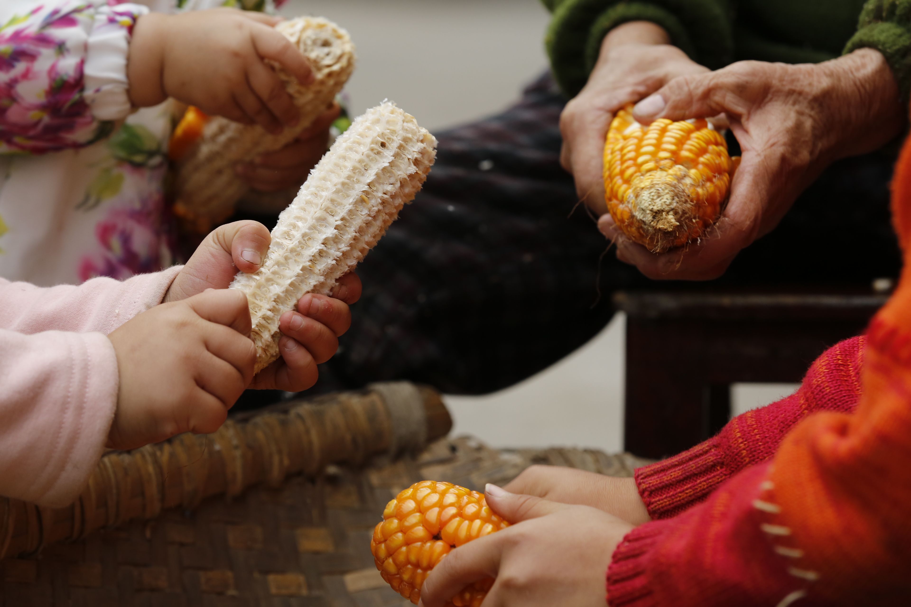 圖片說明:貴州貴陽苗族老年人與兒童剝玉米