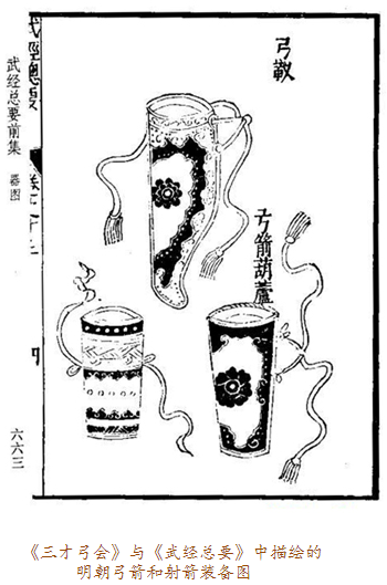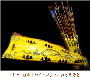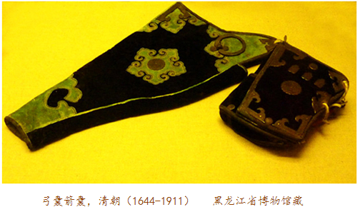 當(dāng)弓囊出現(xiàn)在眼前時(shí),我們應(yīng)當(dāng)想到它的另一半——箭囊。實(shí)事上,古代盛裝弓箭的器物被稱為櫜鞬(gāo jiàn),櫜盛箭,鞬裝弓,多以皮革制作。比如明十三陵出土的萬歷皇帝陪葬品櫜鞬,就用皮革縫制,外敷黃色素緞,金繡龍紋,鑲嵌金飾件及各色寶石。一般來說,弓囊為上寬下窄的袋形,箭囊則為長(zhǎng)方形。在蒙古語(yǔ)中,弓囊與箭囊合稱為“撒答”。因?yàn)椤按稹迸c“袋”讀音相近,所以元代的漢族作家便在作品中將之寫為“撒袋”。這樣,“撒袋”一詞便入了漢語(yǔ)詞匯,特指裝弓盛箭的袋子。