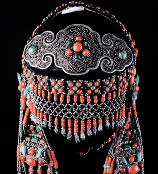 清代烏拉特蒙古族婦女頭飾, 具有著豐富的民俗思想和宗教思想。如頭飾中鑲嵌的珊瑚, 有的雕成日形, 有的雕成月形, 亦有山形、火形等等, 這與蒙古族自古以來的薩滿教崇拜有關。又如銀托座做成蓮花形、金鋼杵形或法輪形, 這又受喇嘛教的深刻影響。再如飾物做成魚形、蝙蝠形、壽字、喜字等等,則是中原漢族常用的吉祥圖案, 是漢文化滲入的反映。復如飾物上的珠子多為奇數(shù), 有三、九或是三、九的倍數(shù)等, 這是蒙古族長期形成的民族吉數(shù), 以九為大。整個頭飾就是一部民族思想觀念的綜匯大成。