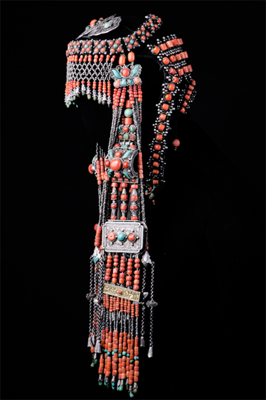 髻側流蘇飾:系于鬢角兩側,其上部銀飾造型從整體上看似飛翔狀蝴蝶,鑲嵌精美紅珊瑚珠、綠松石,造型熱情似火。蝴蝶銀飾之下垂系五條流蘇, 由紅珊瑚珠、綠松石珠及銀珠串間隔穿成五段,下墜蝴蝶型銀飾帽, 內(nèi)銜桃形瑪瑙墜,流蘇在鬢角兩側隨頭的轉動而飄擺, 響聲清脆。