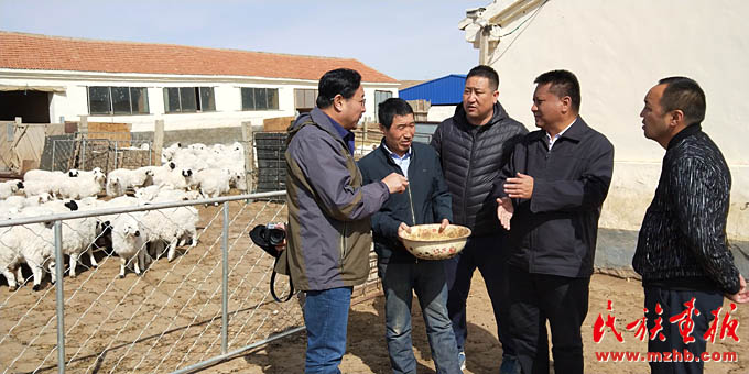 寶力根蘇木黨委書(shū)記青格勒(右2)和牧民研究新型羊飼料