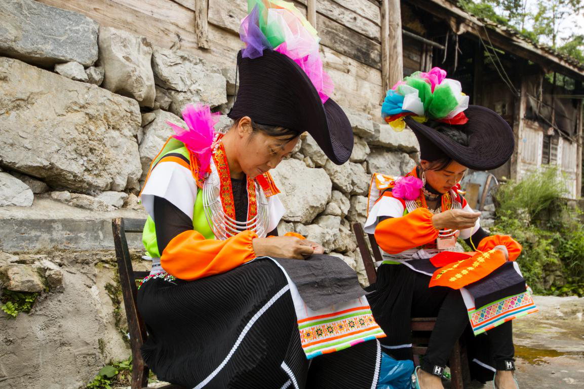 而批林村的女子傳統(tǒng)服飾較之男子則略顯復(fù)雜。批林村女子上衣以短袖開衫服飾為主,短袖開衫服飾顏色多變。在短袖開衫上還需戴上刺繡而成的背牌,背牌分為兩扇,一前一后。后背牌較大,但較短。前背牌較長,長至腰,背牌系帶上繡有圖案,以花草為主,顏色多變,前背牌需要用腰帶系住。批林村年輕女子在背牌之上還會(huì)帶上銀飾,胸前銀飾以銀圈為主。后背則是一串圖案銀飾,圖案多花草。除了前后背牌有銀飾外,前后背牌系帶上也有圓形雕花銀飾。批林村女子下裳則是以百褶裙為主,百褶裙顏色多以黑色為主,在下裙擺繡以白邊。百褶裙前還有系有兩層黑色圍腰,身后有三條彩帶自腰間垂下,垂至小腿。彩帶顏色亮麗,圖案優(yōu)美。批林村女子頭飾是用六米長的青褐布折成,形式像一只船,稱為百褶帽,常用重大節(jié)慶,一些女子還會(huì)在百褶帽上繡上彩巾。