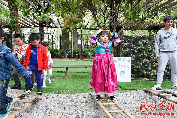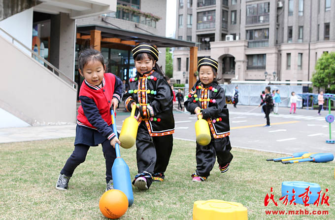 畬族的“摘柿子”、維吾爾族的“賽馬”、黎族的“跳竹竿”、蒙古族的“射箭”……天恒名都幼兒園的操場上,孩子們正積極參加各種民族游戲活動(dòng),沉浸在無憂無慮的快樂中。4月13日,是上海市莘莊工業(yè)園區(qū)天恒名都幼兒園的“民族接力棒小社團(tuán)”活動(dòng)日,孩子們非常期盼這每周一次的活動(dòng)日。