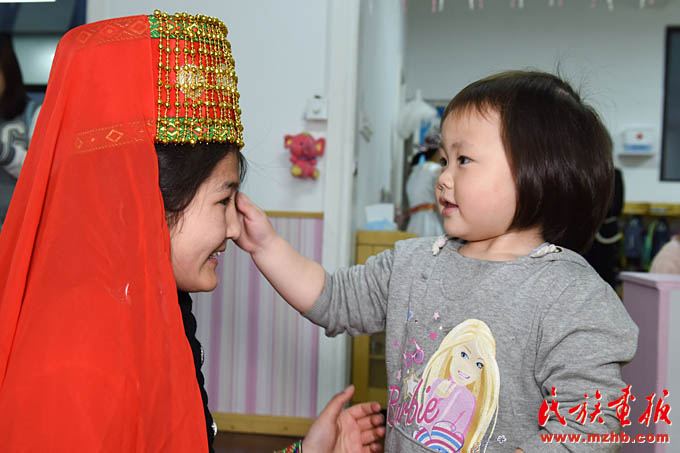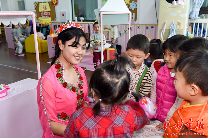 自2014年首場“民族風(fēng)吹進(jìn)幼兒園,愛心曲唱暖身邊人”公益活動(dòng)獲得積極反響后,幼兒園黨支部、工會(huì)、團(tuán)支部牽手園區(qū)民族團(tuán)結(jié)共建單位,走出校園、貼近社區(qū),以愛心義賣、義拍、定向捐助等方式為園區(qū)少數(shù)民族困難家庭送去關(guān)懷。在近幾年的園區(qū)民族工作實(shí)踐中,天恒名都幼兒園的“家、校、社、企”聯(lián)動(dòng)模式不斷發(fā)展創(chuàng)新,培育孵化出少數(shù)民族(幼教)實(shí)習(xí)點(diǎn)、少數(shù)民族志愿者服務(wù)隊(duì)等形式的實(shí)習(xí)模式。2013年至今,幼兒園已為上海市群益職業(yè)技術(shù)學(xué)校的“新疆班”學(xué)生210人次提供了實(shí)習(xí)崗位。