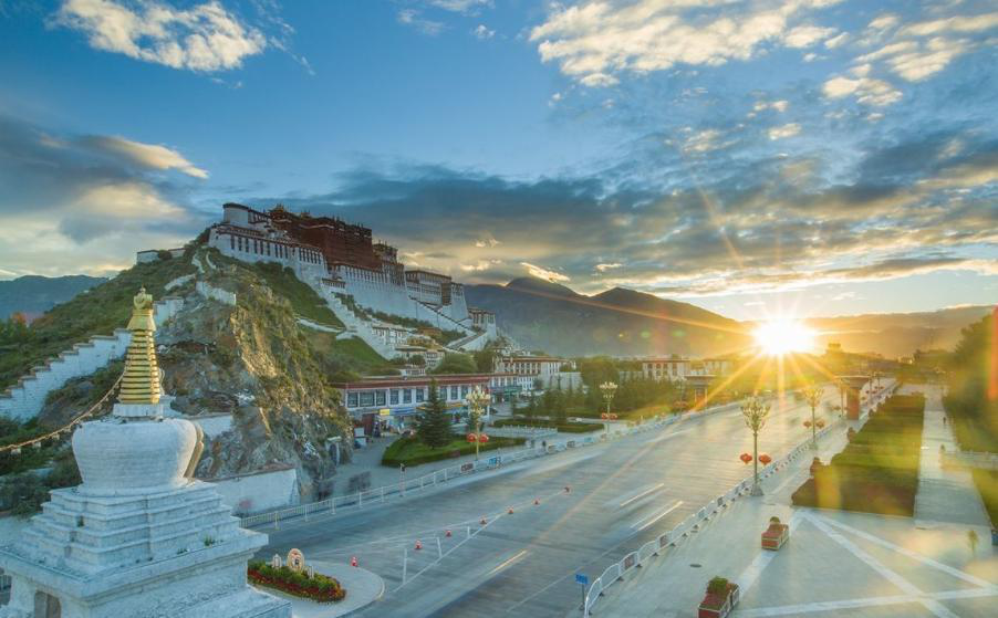 布達(dá)拉宮在西藏拉薩西北的瑪布日山上,是著名的宮堡式建筑群,藏族古建筑藝術(shù)的精華。宮堡依山而建,宮體主樓13層,高115米,全部為石木結(jié)構(gòu),5座宮頂覆蓋鎦金銅瓦,金光燦爛,氣勢雄偉,是藏族古建筑藝術(shù)的精華。