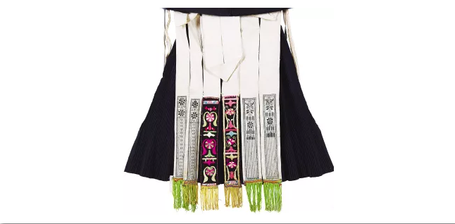 與北方少數(shù)民族圍腰的簡練大氣相比,南方少數(shù)民族的圍腰則更顯秀美精細(xì),且常常佩戴前后兩塊圍腰。貴州開陽地區(qū)苗族女子的盛裝造型,就包含了層疊式前圍腰和飄帶式后圍腰:前圍腰分為5層,每層皆以數(shù)紗繡為主要裝飾工藝,結(jié)合絳子邊與金屬裝飾線,并用棉布進行包邊處理,圍腰面積較大且重量較沉,穿著時系在上衣與坎肩之外,上端兩角自然下翻。后圍腰以本白色棉布為料,分為6條飄帶,裝飾部位集中于飄帶下方,其中左右兩對飾有數(shù)紗繡,中間一對則為黑地彩色平繡,飄帶底部還縫綴彩色流蘇,頗具動感。細(xì)致的手工裝點出苗家女子之貌美,也彰顯著苗家女子之手巧。