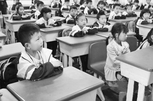 7歲的李曉彤(右)在華山小學(xué)教室晨讀。