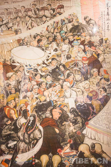 鑒賞展現(xiàn)場,不少前來參觀的畫家都是韓書力的學生或在一定時期曾受其教導?!?973年,我在西藏自治區(qū)展覽館見到了韓書力老師,第一次見面我就拜了師。我們一起下鄉(xiāng),我就給他當導游和翻譯。30幾年來,我一直在學習韓老師的繪畫技法,到現(xiàn)在還是他的學生。韓老師創(chuàng)作《毛主席派人來》時,我就跟在旁邊學習。學到了一些創(chuàng)作獨幅作品的技巧和手法,讓我受用至今?!蔽鞑厍嗄戤嫾矣嬅莱嗔姓f。