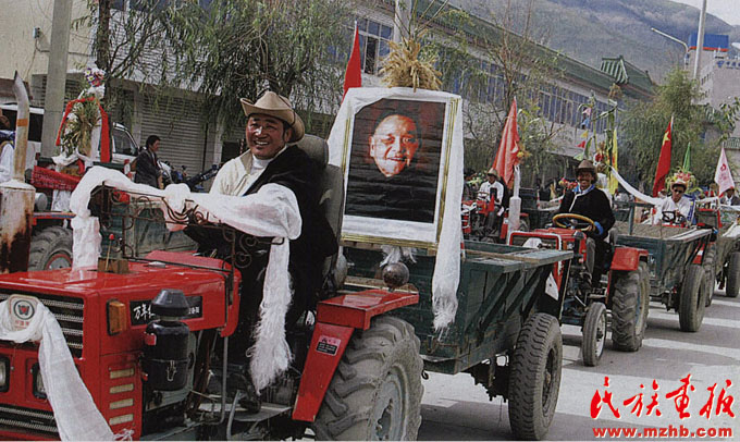 2004年8月21日,西藏山南地區(qū)乃東縣的農(nóng)牧民高懸鄧小平畫像,開著拖拉機在山南街頭巡游,表達對改革開放總設(shè)計師鄧小平同志的深切緬懷。改革開放后,西藏自治區(qū)農(nóng)牧民的年人均收入已從改革開放初期的幾百元上升至2004年的2000元左右,西藏城鎮(zhèn)居民年收入則超過7000元,位居西部前列。《民族畫報》2008年第12期