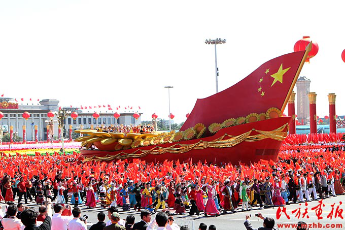新中國成立以來,黨和國家始終堅持把馬克思主義民族理論同中國民族問題具體實際相結(jié)合,始終堅持把民族工作作為一項重大工作來抓,團結(jié)帶領(lǐng)全國各族人民共同團結(jié)奮斗,共同繁榮發(fā)展,開創(chuàng)了中國特色解決民族問題的正確道路,取得了舉世矚目的成就,積累了彌足珍貴的成功經(jīng)驗。2009年10月1日,在北京天安門廣場,20萬軍民以盛大的閱兵儀式和群眾游行歡慶新中國60華誕,圖為各民族學(xué)生參加“團結(jié)奮進”方陣群眾游行?!睹褡瀹媹蟆?009年第10期