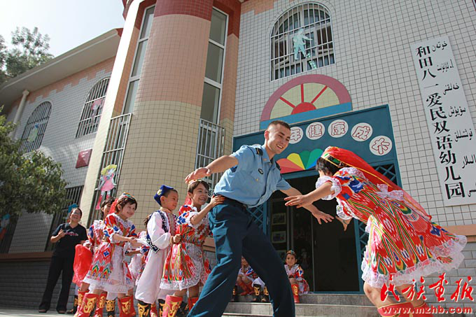 民族團結(jié)是國家統(tǒng)一、繁榮昌盛的前提和保證,各民族“共同團結(jié)奮斗,共同繁榮發(fā)展”是我國民族工作的主題。全國各地扎實開展民族團結(jié)進步創(chuàng)建工作,平等團結(jié)互助和諧的社會主義民族關(guān)系進一步鞏固和發(fā)展。2011年,空軍駐新疆和田某指揮所首次投資80萬元,開辦了和田八一愛民雙語幼兒園,讓30個家庭的孩子進入雙語班成為首批“藍天春蕾兒童”。圖為維吾爾族戰(zhàn)士艾力夏提和該園兒童一起玩老鷹捉小雞游戲?!睹褡瀹媹蟆?011年第11期