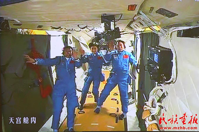 2012年6月18日,神舟九號飛船與天宮一號完成自動交會對接,兩飛行器形成穩(wěn)定運行的組合體后,三位航天員先后進入天宮一號目標(biāo)飛行器,這實現(xiàn)了中國載人航天歷史上首次對一個在軌運行的航天器的拜訪和駐留。圖為在北京航天飛控中心大屏幕拍攝到的航天員景海鵬、劉旺、劉洋在天宮一號實驗艙內(nèi)的畫面?!睹褡瀹媹蟆?012年第7期