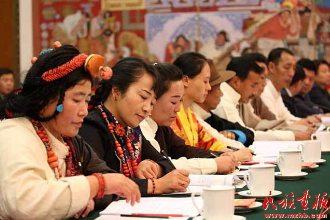 2017年10月18日,在中國共產(chǎn)黨第十九次全國代表大會上,習(xí)近平鄭重宣示:“經(jīng)過長期努力,中國特色社會主義進入了新時代,這是我國發(fā)展新的歷史方位?!笔糯髨蟾嬷?,習(xí)近平用五句話深刻揭示了新時代的內(nèi)涵,指出這個新時代,是承前啟后、繼往開來、在新的歷史條件下繼續(xù)奪取中國特色社會主義偉大勝利的時代,是決勝全面建成小康社會、進而全面建設(shè)社會主義現(xiàn)代化強國的時代,是全國各族人民團結(jié)奮斗、不斷創(chuàng)造美好生活、逐步實現(xiàn)全體人民共同富裕的時代,是全體中華兒女勠力同心、奮力實現(xiàn)中華民族偉大復(fù)興中國夢的時代,是我國日益走近世界舞臺中央、不斷為人類作出更大貢獻的時代。圖為席黨的十九大的西藏自治區(qū)代表團代表在討論十九大報告?!睹褡瀹媹蟆?017年第11期