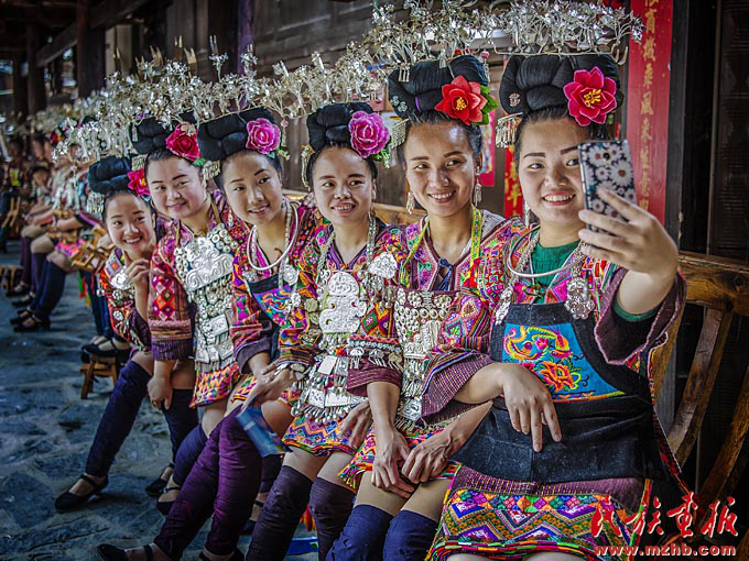 經(jīng)歷改革開放40年的發(fā)展,我國社會生產(chǎn)力、綜合國力、人民生活水平實現(xiàn)了歷史性跨越,全黨全國各族人民要更加緊密地團結(jié)在以習(xí)近平同志為核心的黨中央周圍,高舉中國特色社會主義偉大旗幟,不忘初心,牢記使命,將改革開放進行到底,不斷實現(xiàn)人民對美好生活的向往,在新時代創(chuàng)造中華民族新的更大奇跡。圖為貴州民眾盛裝自拍?!睹褡瀹媹蟆?018年第3期