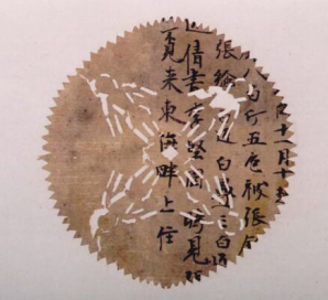 考古人員在阿斯塔那墓葬中還發(fā)現(xiàn)了兩種不同的人形剪紙,一種是剪成并排而立的7人形狀,近似泥俑;另一種在一張寫有文字的圓形紙上,剪刻了4個站立著的人形紋。這兩種人形剪紙造型簡潔,圖案清晰,充滿濃郁的生活氣息。