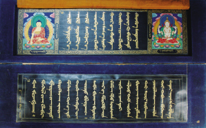 金汁寫本《丹珠爾》由頗羅鼐·索南多杰主持編纂,每函首頁左右浮雕精刻450尊佛像,即釋迦摩尼與金剛心部等如來三十五佛像11套;藥師佛等如來八佛像7套;金剛薩埵、不動佛、大日如來佛像3套。全文烏金字體泥金寫本,字體美觀,書寫工整,筆觸細(xì)膩,顏色鮮麗,金字凸顯。護書版、護書巾、捆書帶、帶扣、東達(dá)(藏文古籍錦緞特制書簽)等亦專門精造細(xì)制,極其華麗珍貴,可謂稀世之寶。該書取名《思希堅極》,意為“世間一絕,舉世無雙”。