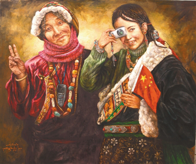 堅(jiān)持寫實(shí)不代表一成不變,天性頑皮的索曼尼有時(shí)候也會(huì)來(lái)些“惡搞”,這也體現(xiàn)在他的繪畫作品中。有一次,索曼尼在羅布林卡看到一位著名的外籍足球教練攜妻子和女兒身著華麗的藏族服飾一起吃藏餐。金發(fā)碧眼的外國(guó)人穿戴藏族服飾也很漂亮,這給索曼尼帶來(lái)很大啟發(fā)。于是喬布斯、科菲·安南、布什、奧巴馬、安吉莉娜·朱莉……這些個(gè)世界上各色人等,還有美國(guó)國(guó)家地理雜志的攝影師史蒂夫·麥凱瑞鏡頭下那個(gè)著名的阿富汗少女,一個(gè)個(gè)來(lái)自迥異社會(huì)文化背景下的人物身著藏裝,被“移植”在輪回轉(zhuǎn)世系列的畫面中,充滿了俏皮感,給人留下深刻的印象。