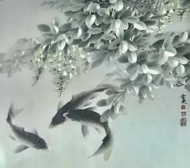 魚是蜀繡中的代表圖案。該繡品針法細膩,片線光亮,色彩典雅。紫藤花與水中的鯉魚動靜結合,相映成趣。