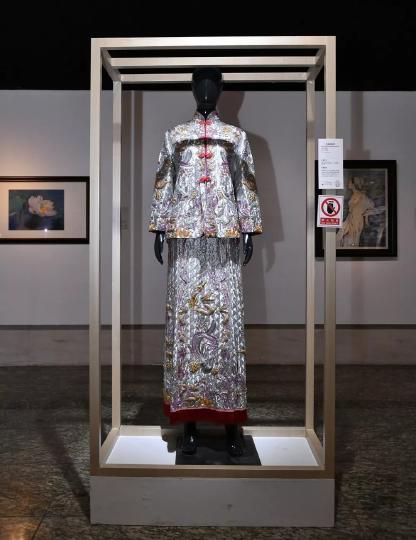 龍鳳褂裙,為女子出嫁與善終之時所穿之物。本作品采用精細金銀線配以潮繡墊高技法,繡制龍鳳圖案多達70余只,成為褂裙等級中的最高規(guī)格“褂王”。