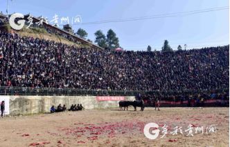 貴州省從江縣第十五屆原生態(tài)侗族大歌節(jié)的前一天,恰逢該縣逢亥斗牛日,丙妹鎮(zhèn)松學(xué)斗牛塘、谷坪鄉(xiāng)四寨河斗牛塘同時(shí)舉辦傳統(tǒng)牛王爭(zhēng)霸賽,喜迎一年一度“侗族大歌節(jié)”的到來(lái),共有來(lái)自周邊村寨的80頭水牯牛參戰(zhàn),斗?;顒?dòng)場(chǎng)上名牛角逐,場(chǎng)面異彩紛呈,吸引數(shù)萬(wàn)名觀眾前來(lái)觀戰(zhàn)。